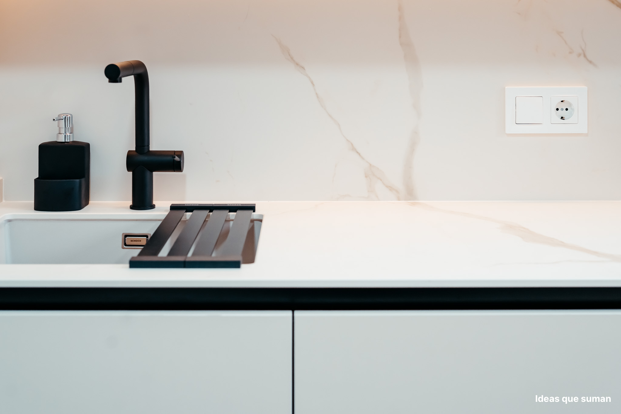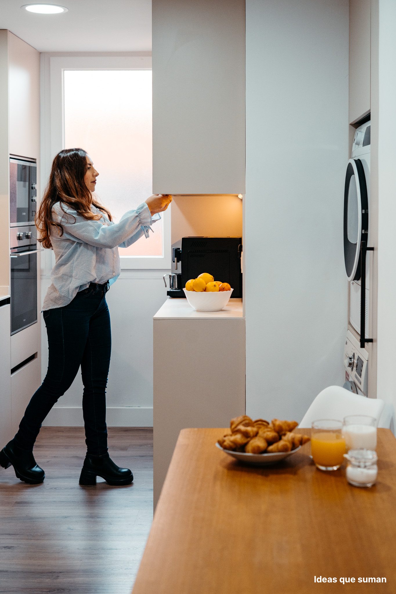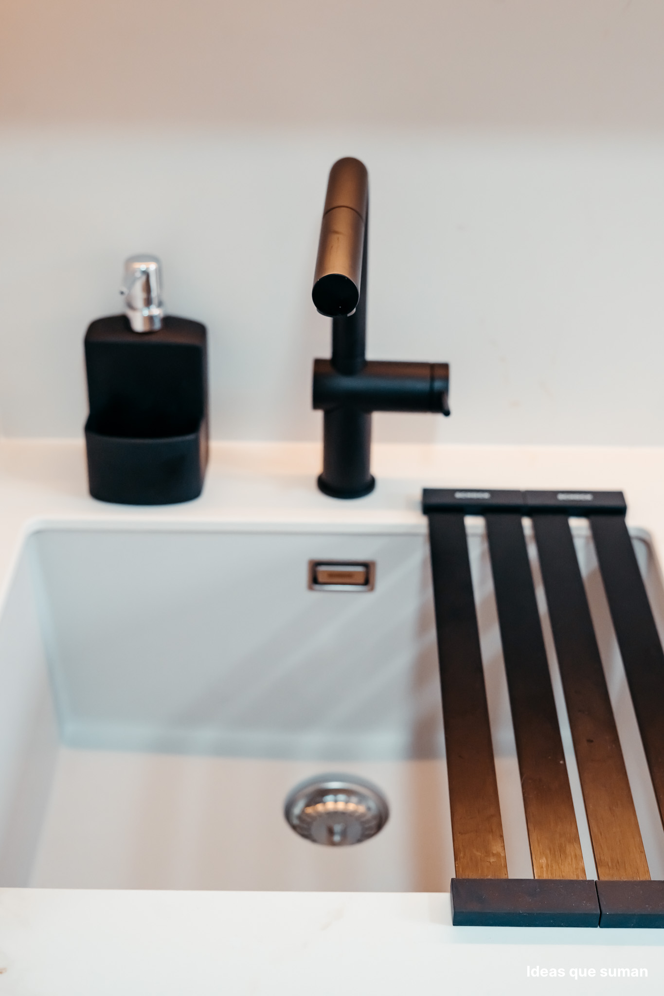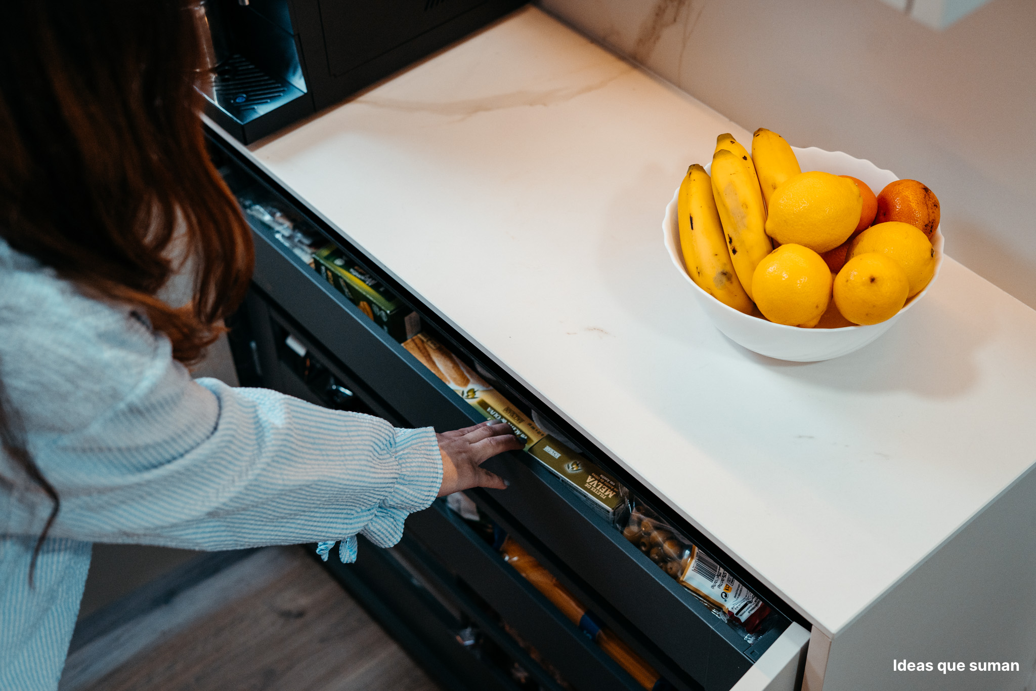 La distribución del espacio ha sido cuidadosamente planificada para maximizar la eficiencia. Uno de sus frentes está destinado al trabajo, con la zona de aguas y la zona de trabajo, mientras que en el otro frente se encuentra un desayunador con una encimera destinada a trabajos más ligeros.