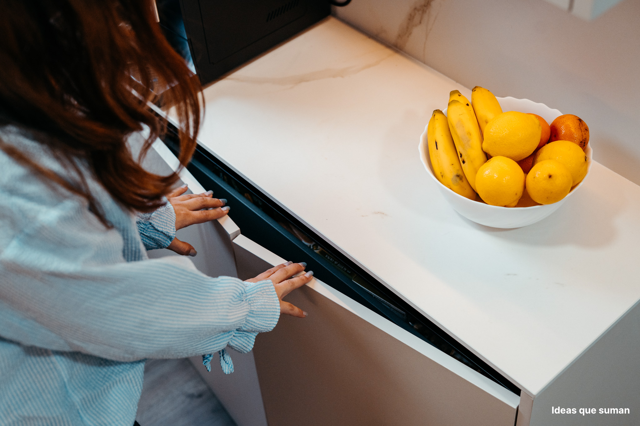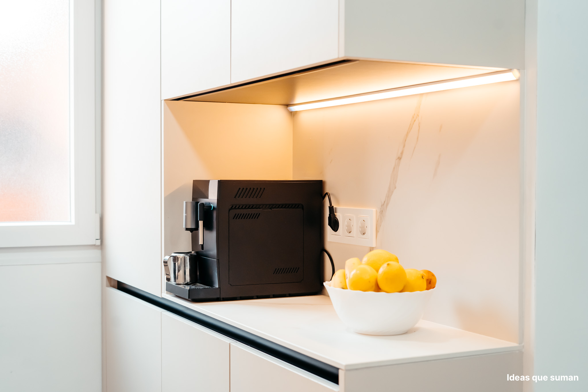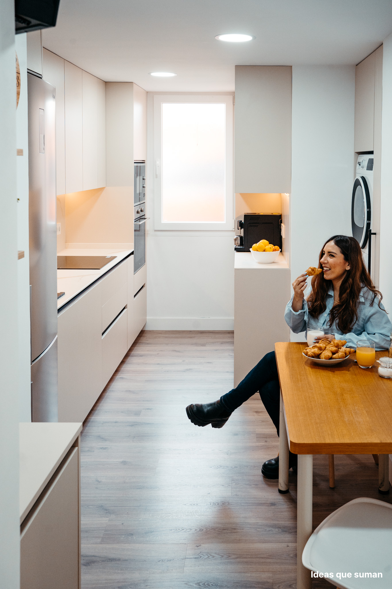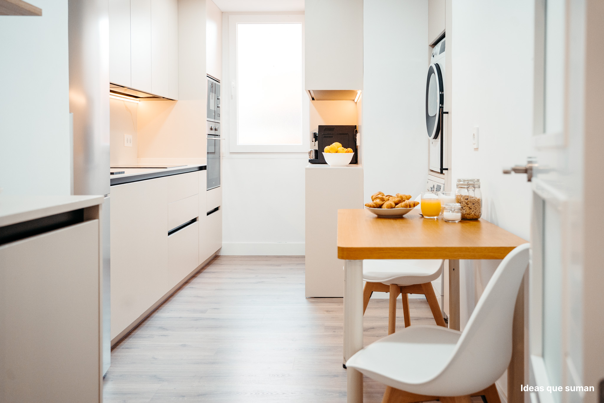 La distribución del espacio ha sido cuidadosamente planificada para maximizar la eficiencia. Uno de sus frentes está destinado al trabajo, con la zona de aguas y la zona de trabajo, mientras que en el otro frente se encuentra un desayunador con una encimera destinada a trabajos más ligeros.