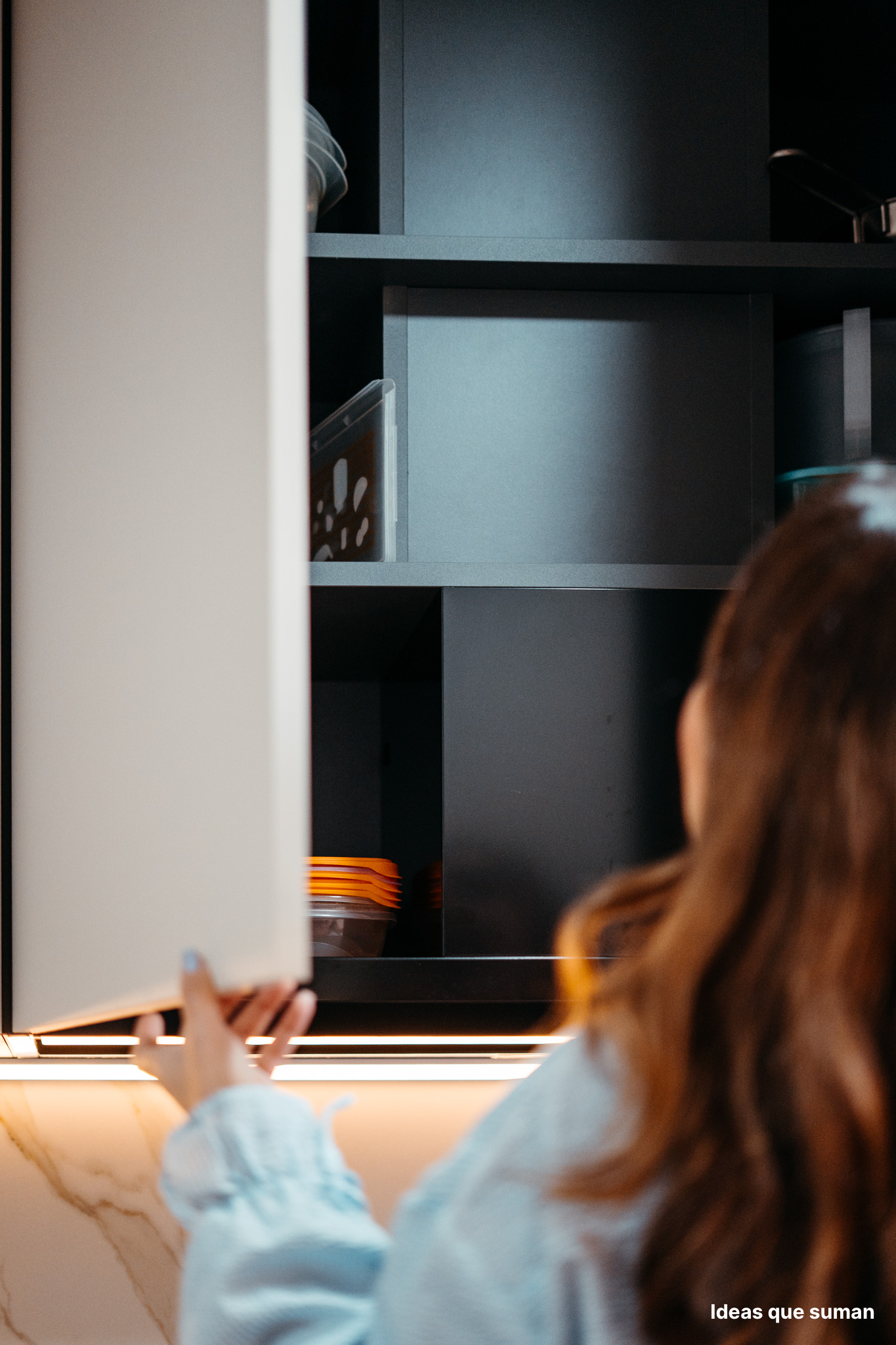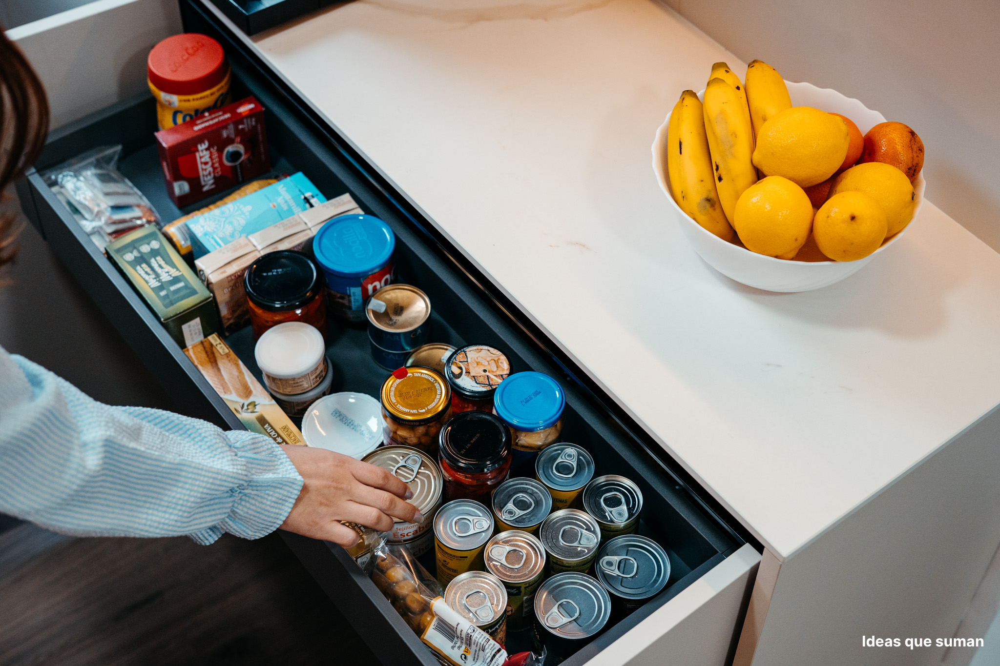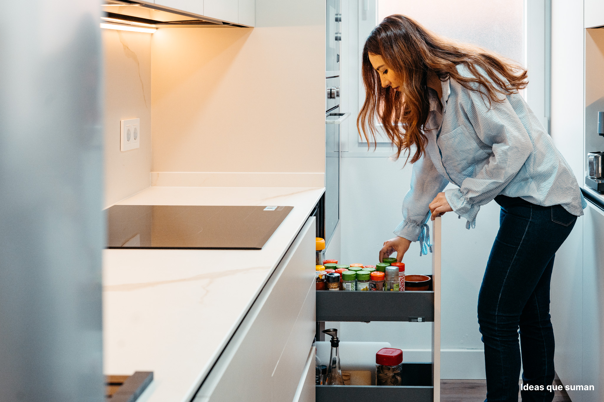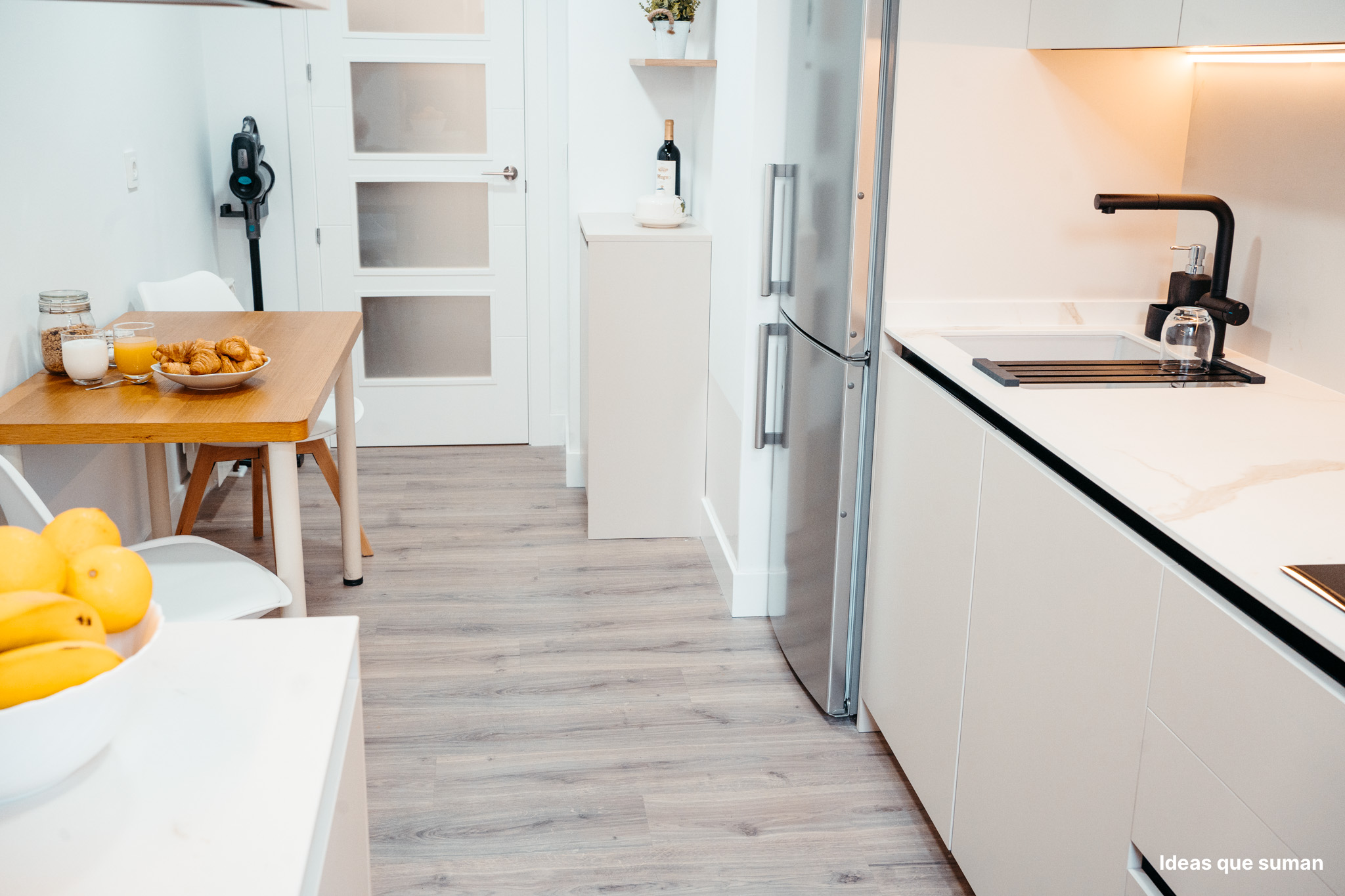 La distribución del espacio ha sido cuidadosamente planificada para maximizar la eficiencia. Uno de sus frentes está destinado al trabajo, con la zona de aguas y la zona de trabajo, mientras que en el otro frente se encuentra un desayunador con una encimera destinada a trabajos más ligeros.