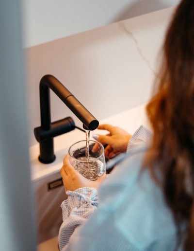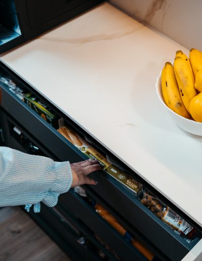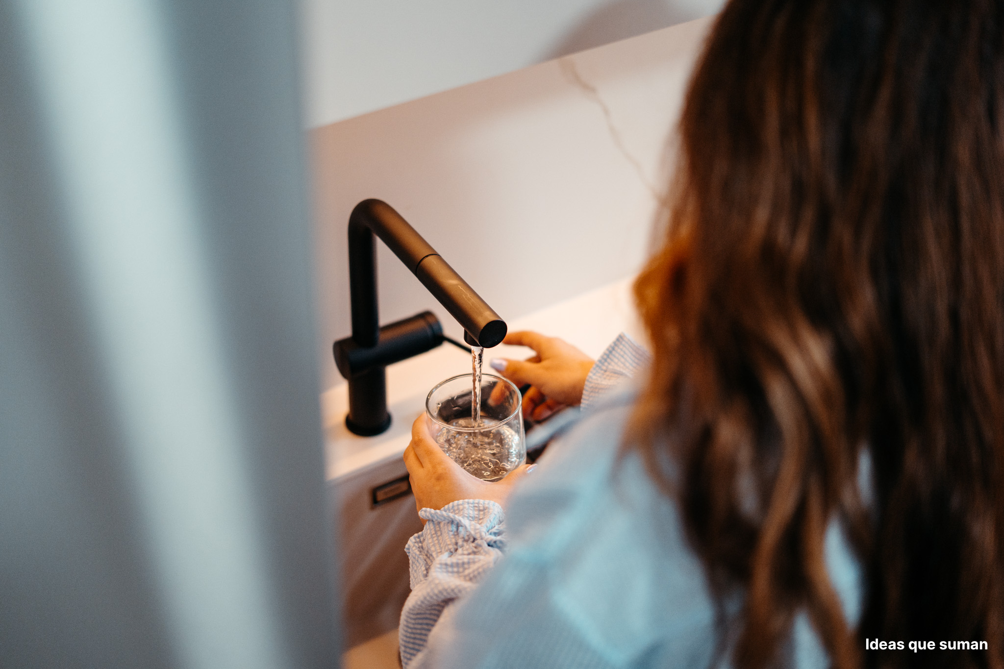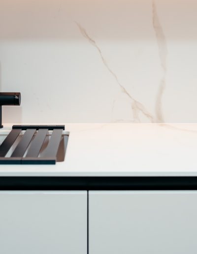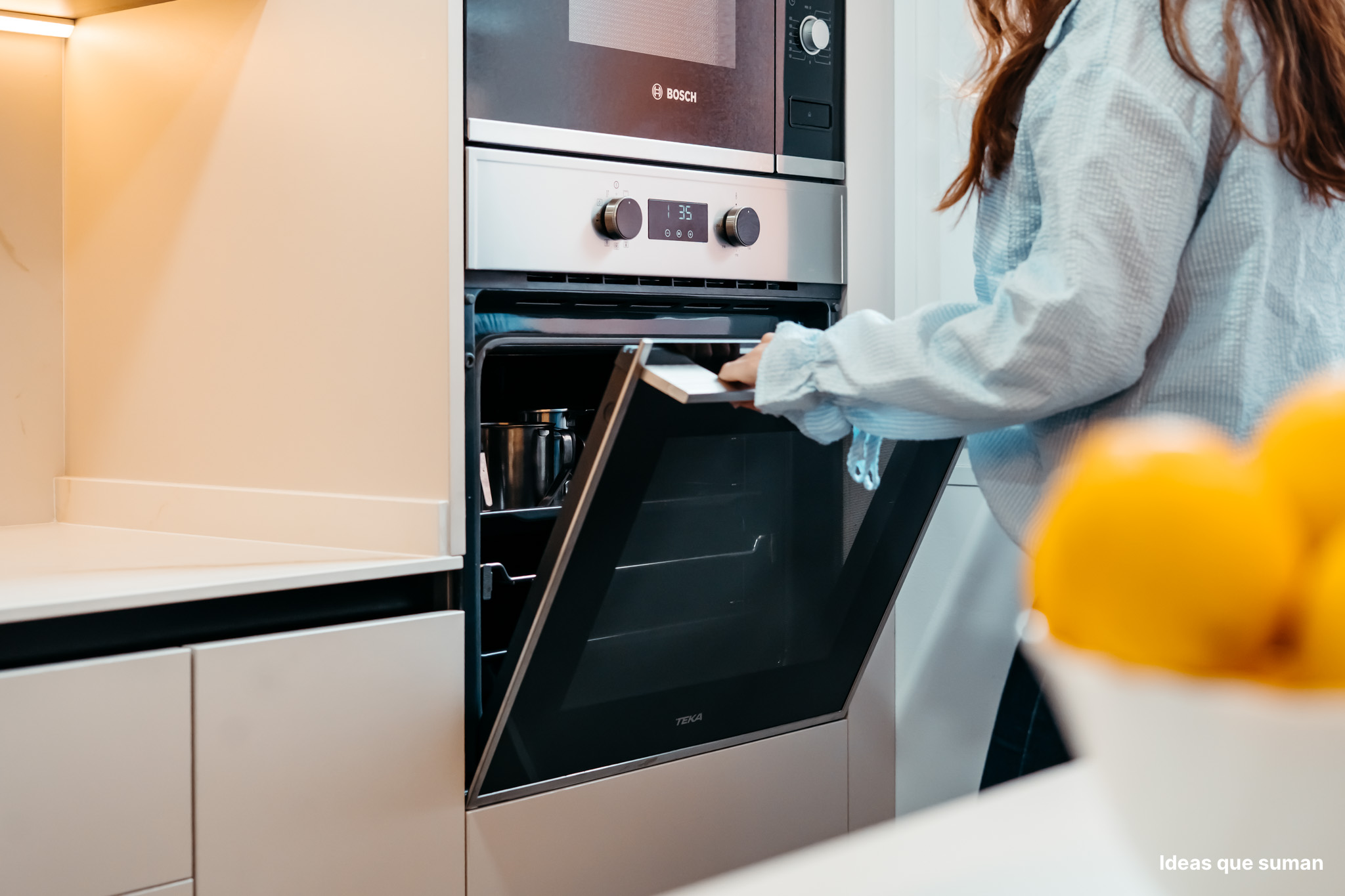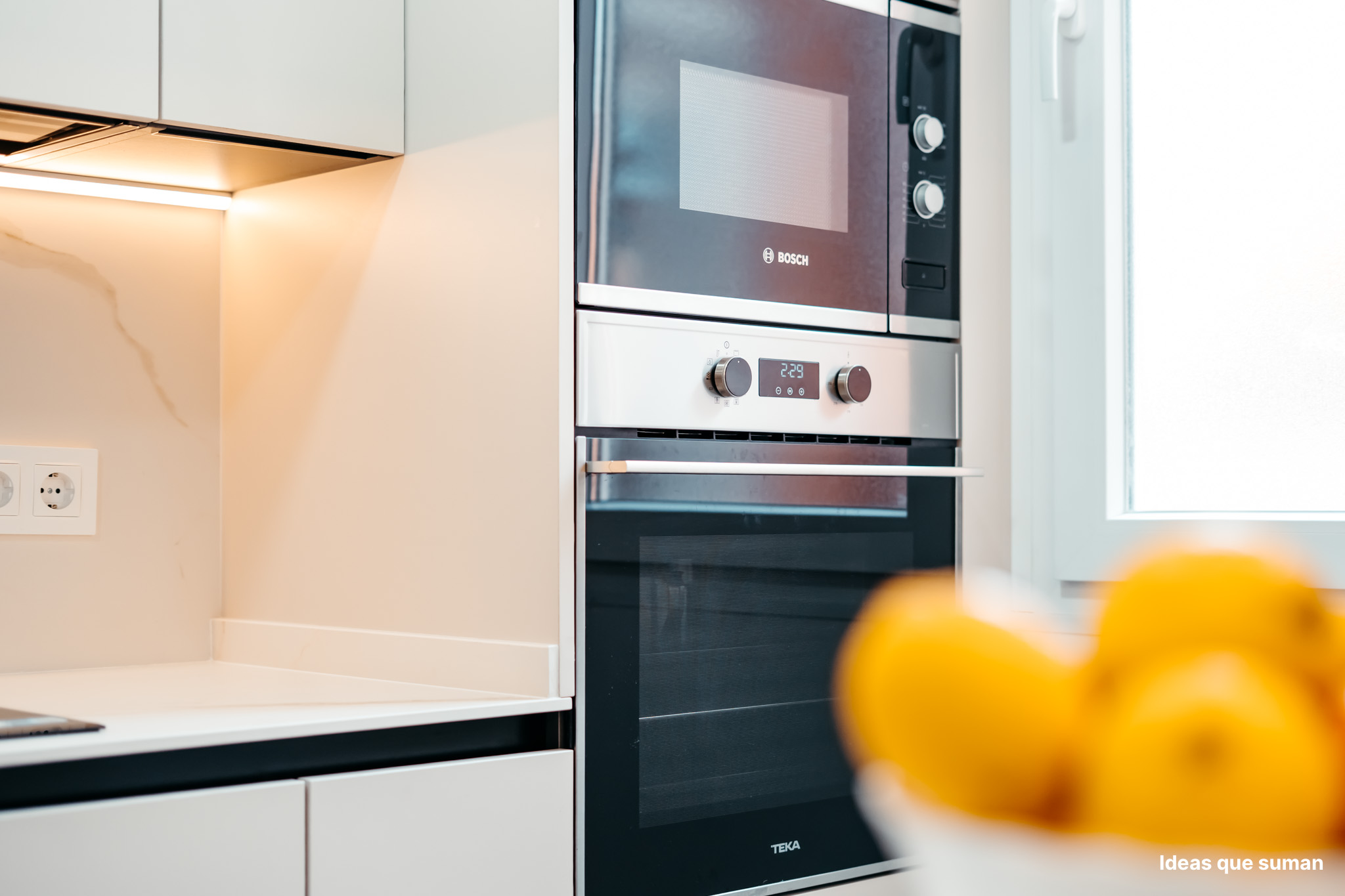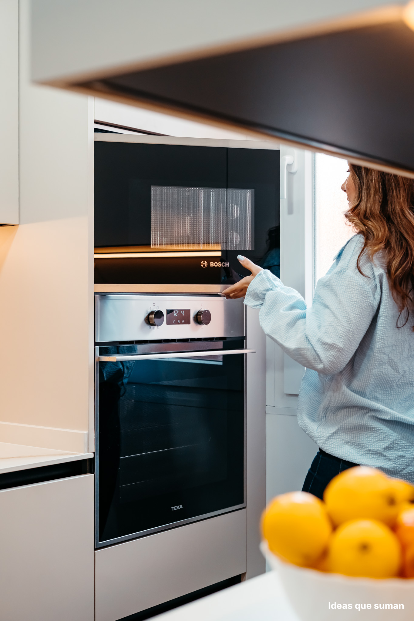 La distribución del espacio ha sido cuidadosamente planificada para maximizar la eficiencia. Uno de sus frentes está destinado al trabajo, con la zona de aguas y la zona de trabajo, mientras que en el otro frente se encuentra un desayunador con una encimera destinada a trabajos más ligeros.