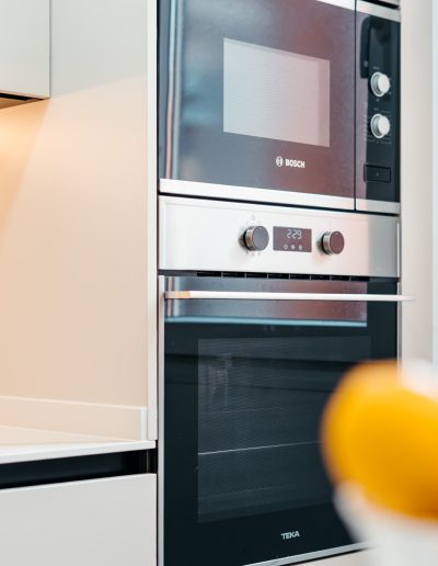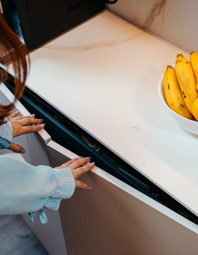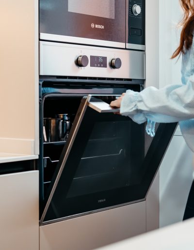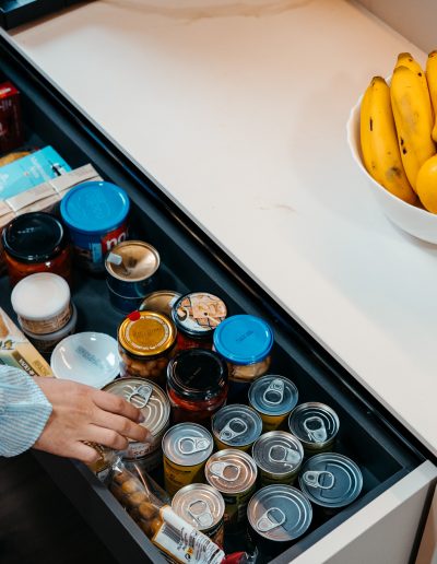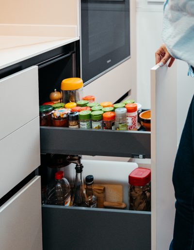 Las gavetas cuentan con autofreno y extracción total, utilizando herrajes Blum de alta calidad. Los soportes para entrepaños son ocultos, y los colgadores pueden soportar hasta 77 kg, siendo además antivuelco.