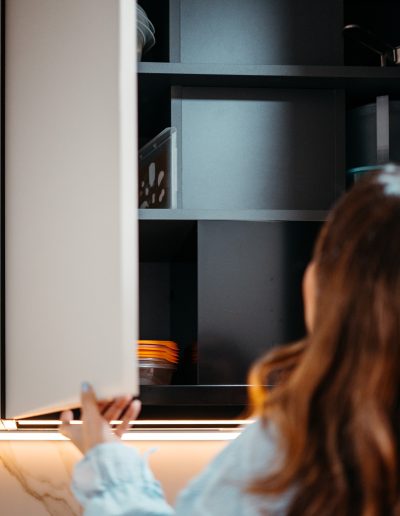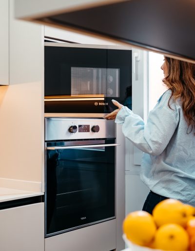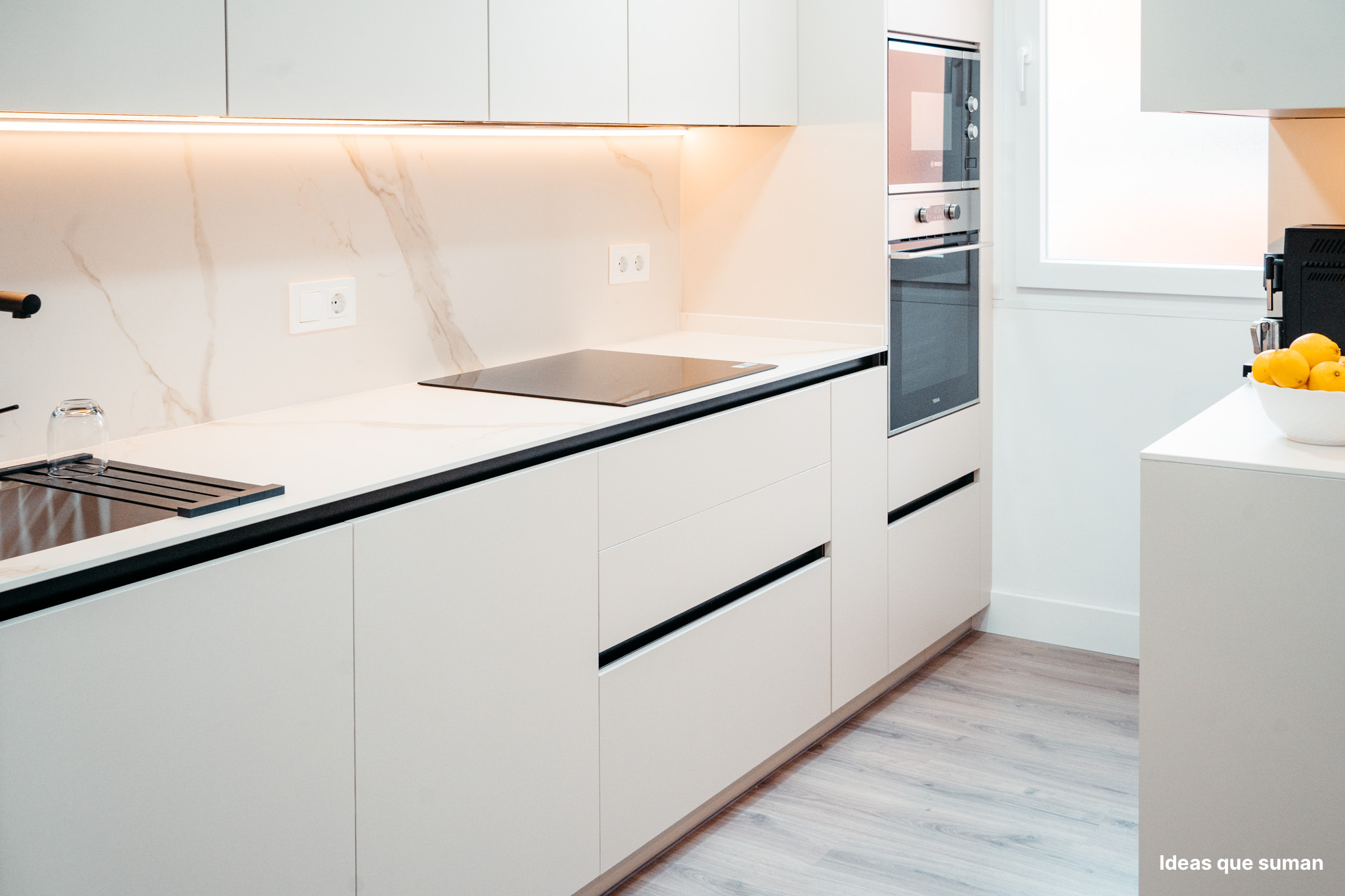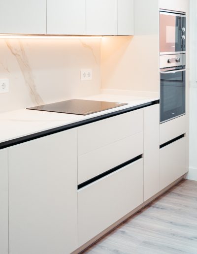 «Abrazo de Invierno» es una cocina diseño moderno y minimalista que combina elegantes tonos blancos con acentos cálidos de madera y frentes cashmir, destacando por su luminosidad, amplitud y limpieza visual.